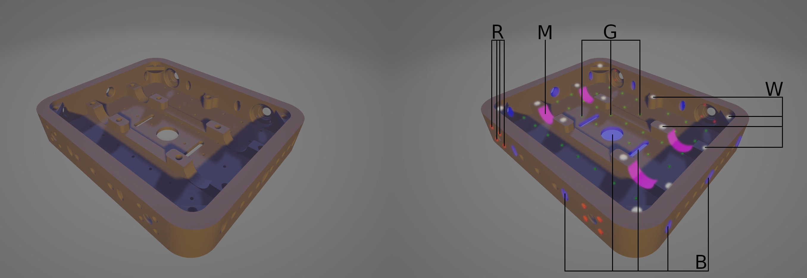 BodyRend Published 2022-04-08 at 2712 × 937 in Robut R: face mount screws for gearbox G: 20x20mm grid W: Melt inserts for attaching bottom B: holes for wires in/out of body